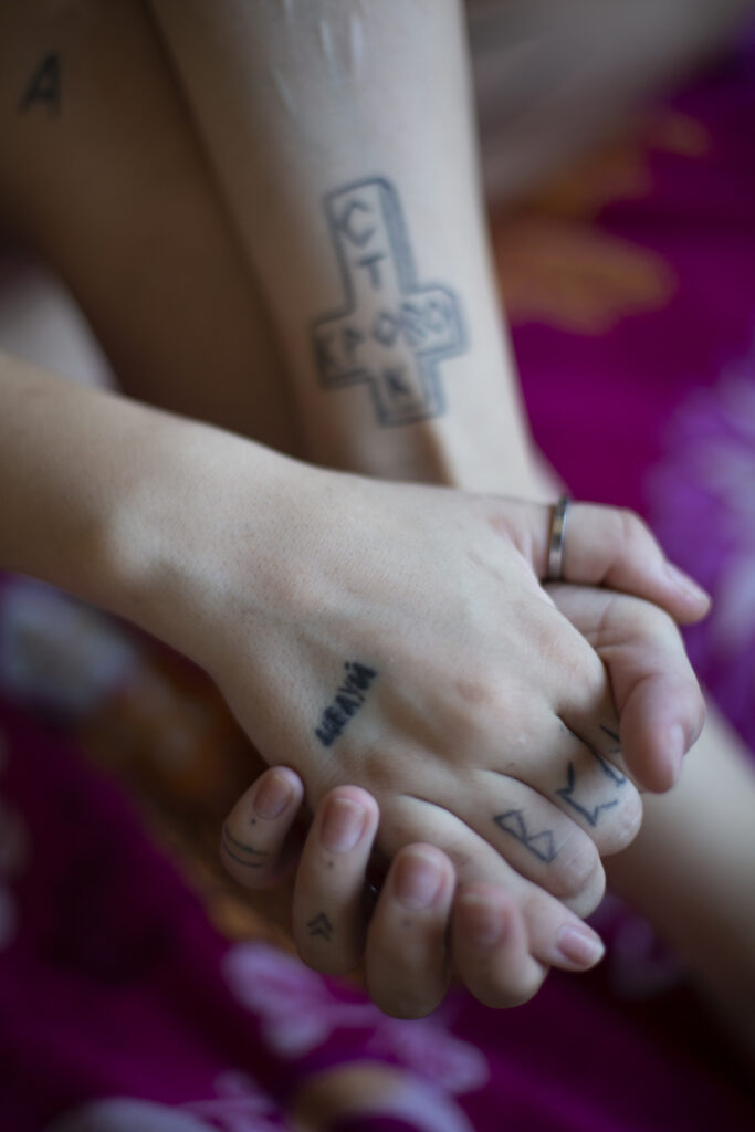 Тогда же набила первые тату на руке: надпись «Целуй» и лесбийский знак с двумя девчонками. Было страшно — я понимала, что мать все это увидит, когда я вернусь. Так и произошло, и она предложила мне выжечь тату марганцовкой. Когда я отказалась, мать выгнала меня из дома. Приютила подруга. Живя у нее, я приняла решение снять хиджаб. Сначала было ужасно некомфортно: было такое ощущение, будто я выхожу на улицу голая. Все-таки я его девять лет носила. Мне казалось, что все-все на меня смотрят. Но помогли социальные сети. Я веду тик-ток, куда выложила видео, как я снимаю хиджаб. Было много ненависти. Мне писали, что найдут меня, что на меня объявили охоту. Тогда же начали писать разные девчата с просьбой помочь им. Были страшные истории. Но у меня не было ни возможности, ни ресурсов что-то сделать для них, да и возраст их не позволял ничего сделать — они все были несовершеннолетние.