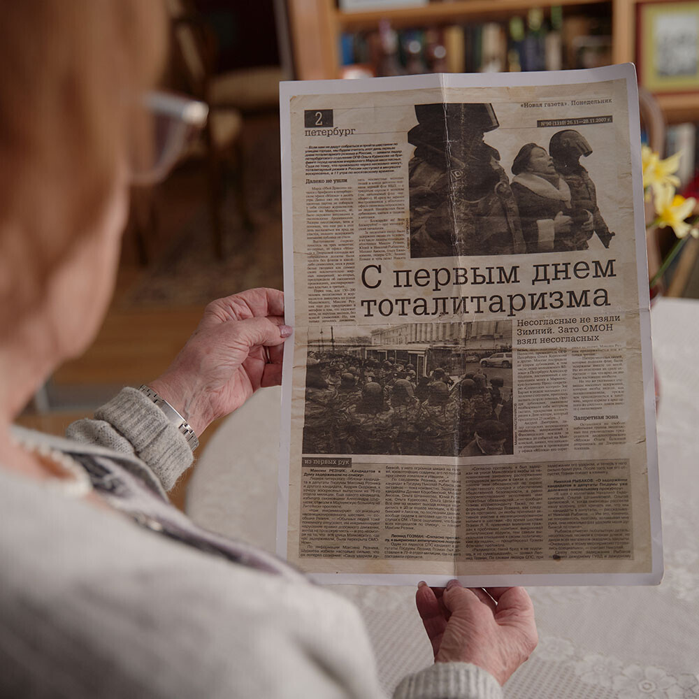 На следующий день звонит дочь: «Мама, ты на первой полосе в “Новой газете”». Я купила газету, а там на первой странице крупными буквами: «С первым днем тоталитаризма!» И фото: два амбала ведут меня под руки. Я эту газету храню.