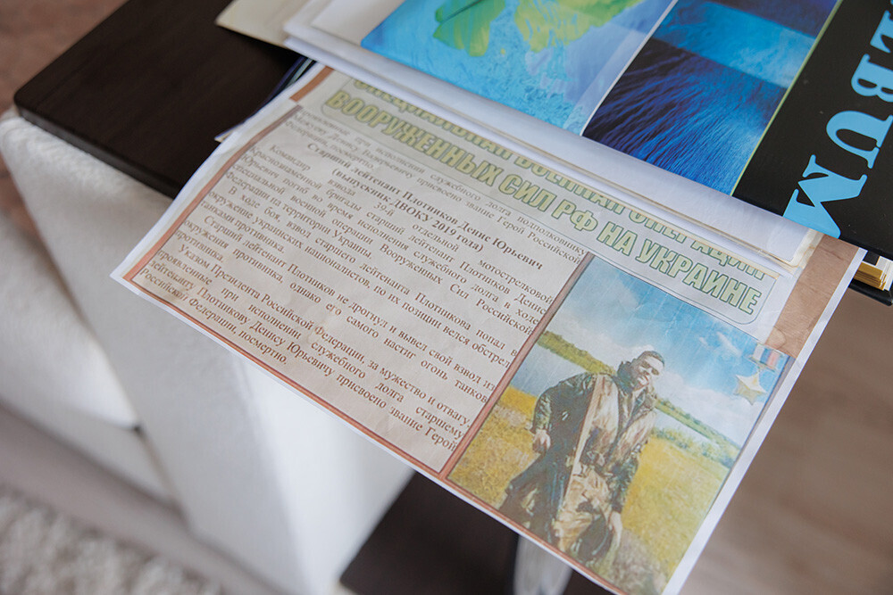 На вопрос, какой смысл был в смерти Дениса, Татьяна говорит: «Родина позвала — и он пошел». Свою семью и страну защищал. На вопрос «От кого?» объясняет: «От противников, чтобы было мирное небо над головой». До 24 февраля Татьяна смотрела Первый канал и читала сахалинские СМИ. Теперь ничего не смотрит и не читает. Сначала не хотела расстраиваться, а сейчас уже не видит смысла.