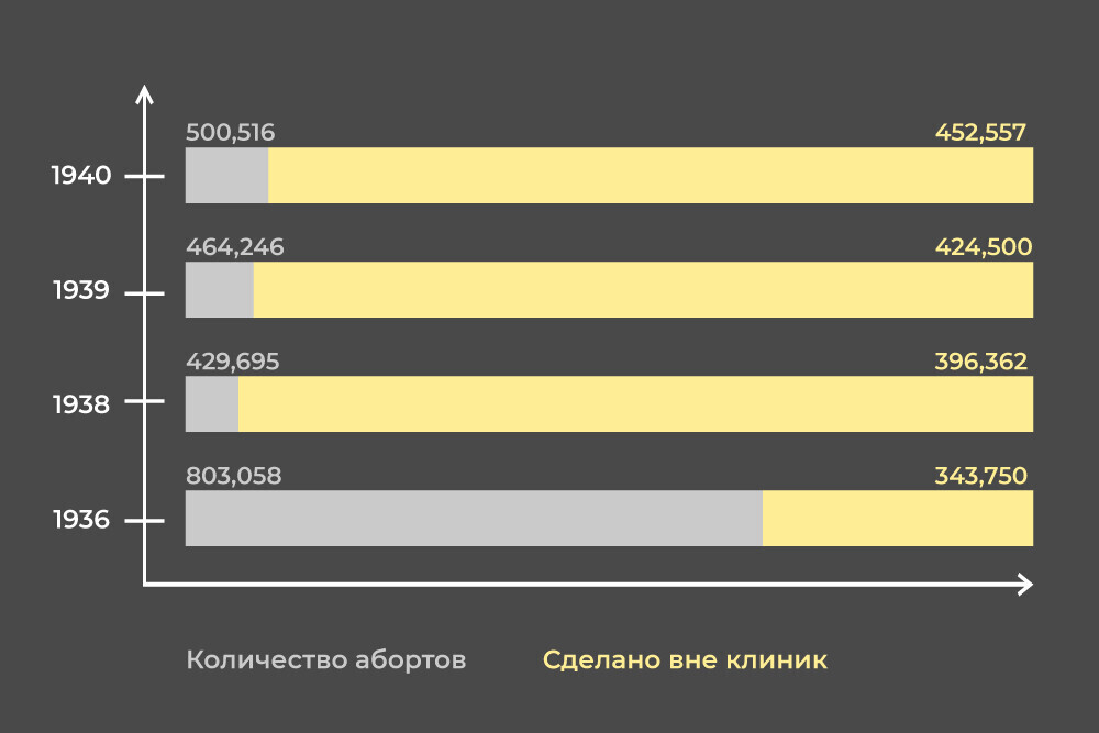Запрет 1936 года, призванный улучшить демографию, привел к тому, что больничную процедуру сменили опасные «народные» способы, чреватые перитонитом, перфорацией матки и потерей фертильности, которая наблюдалась у 18,5–35 процентов женщин. Неудачная операция нередко сопровождалась обильным кровотечением, остановить которое можно было лишь в больничных условиях. Но женщины не доверяли врачам.