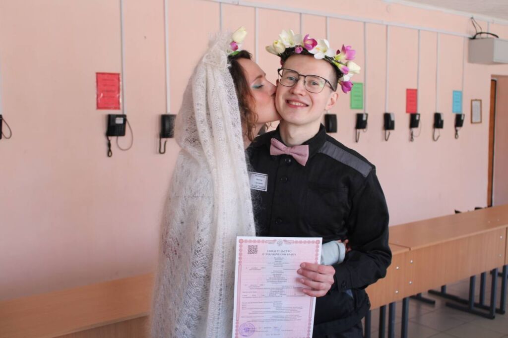 26 февраля 2024 года Виктор Филинков и Евгения Кулакова поженились. И получили долгожданное длительное (трехдневное) свидание, уже как муж и жена. Женя рассказывает: «Можно было пойти в джинсах, и пофиг. Но нам хотелось поднять градус абсурда. Пусть все выглядит как карнавал. Я придумала наряды. Главный элемент — фата. Еще в 2021 году я купила белый оренбургский пуховый платок, потом мы с сестрой сделали венок. Прикол был в том, что переодеться нужно было быстро, чтобы в этом наряде не расхаживать. У Вити был галстук-бабочка, повязанный прямо поверх тюремной робы, а на голове — сделанный вручную венок. Женщина, которая нас регистрировала, сказала: “Какие экстравагантные наряды”».