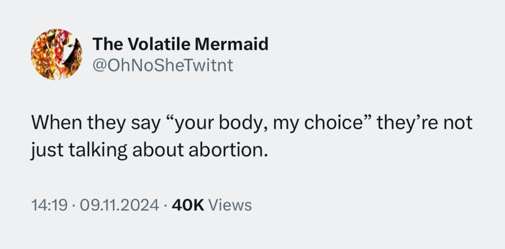 «Когда они говорят “Твое тело — мой выбор”, они имеют в виду не только аборты», — считает пользовательница под ником @OhNoSheTwitnt.