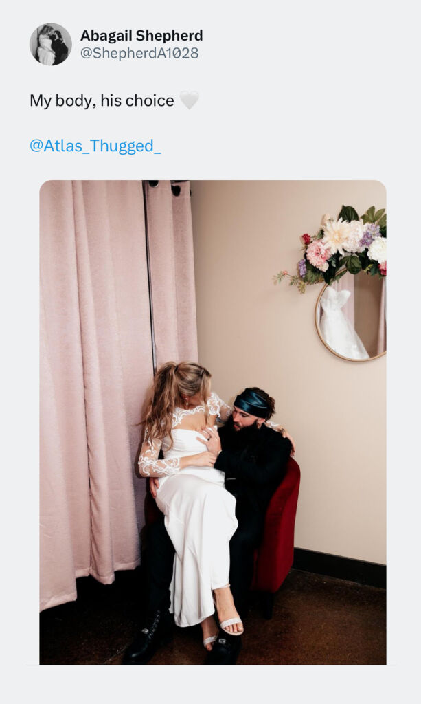 Одна американка опубликовала в соцсети Х фото, на котором она в свадебном платье сидит на коленях у супруга, пока тот сжимает ее грудь ладонью. «Мое тело — его выбор», — подписала она фото. «Христианка. Жена. Американка», — говорится в описании ее профиля.