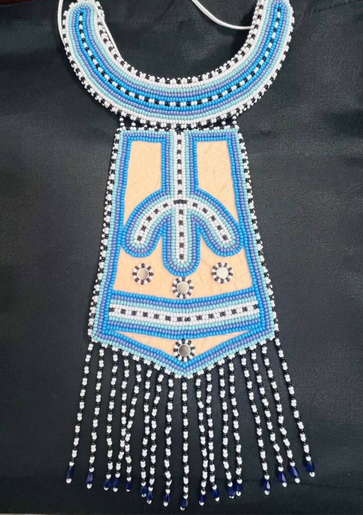 Якутская мастерица Сардаана Пинигина показывает мне по видеосвязи большое голубое колье в форме лапки гагары: по верованиям эвенков, именно эта птица помогла сотворить землю.